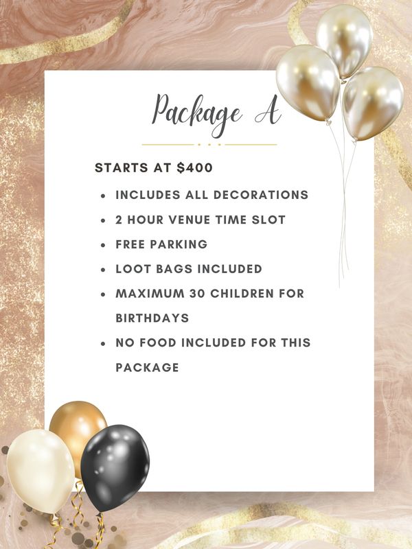 Package A starts at $400. This package is ideal for birthday parties and much more. Customizable options are available for an additional charge. Maximum 30 children for birthday parties.