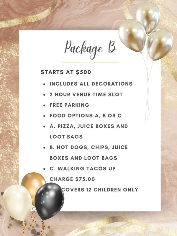 Perfect for any special occasion. This package features themed decor, party favors and food options.