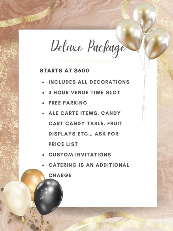 The Deluxe Packages starts at $600. This package is ideal for major celebrations. You’ll enjoy customized decor, invitations and Ale Carte fruit and candy displays. For more information on catering click the link below.
